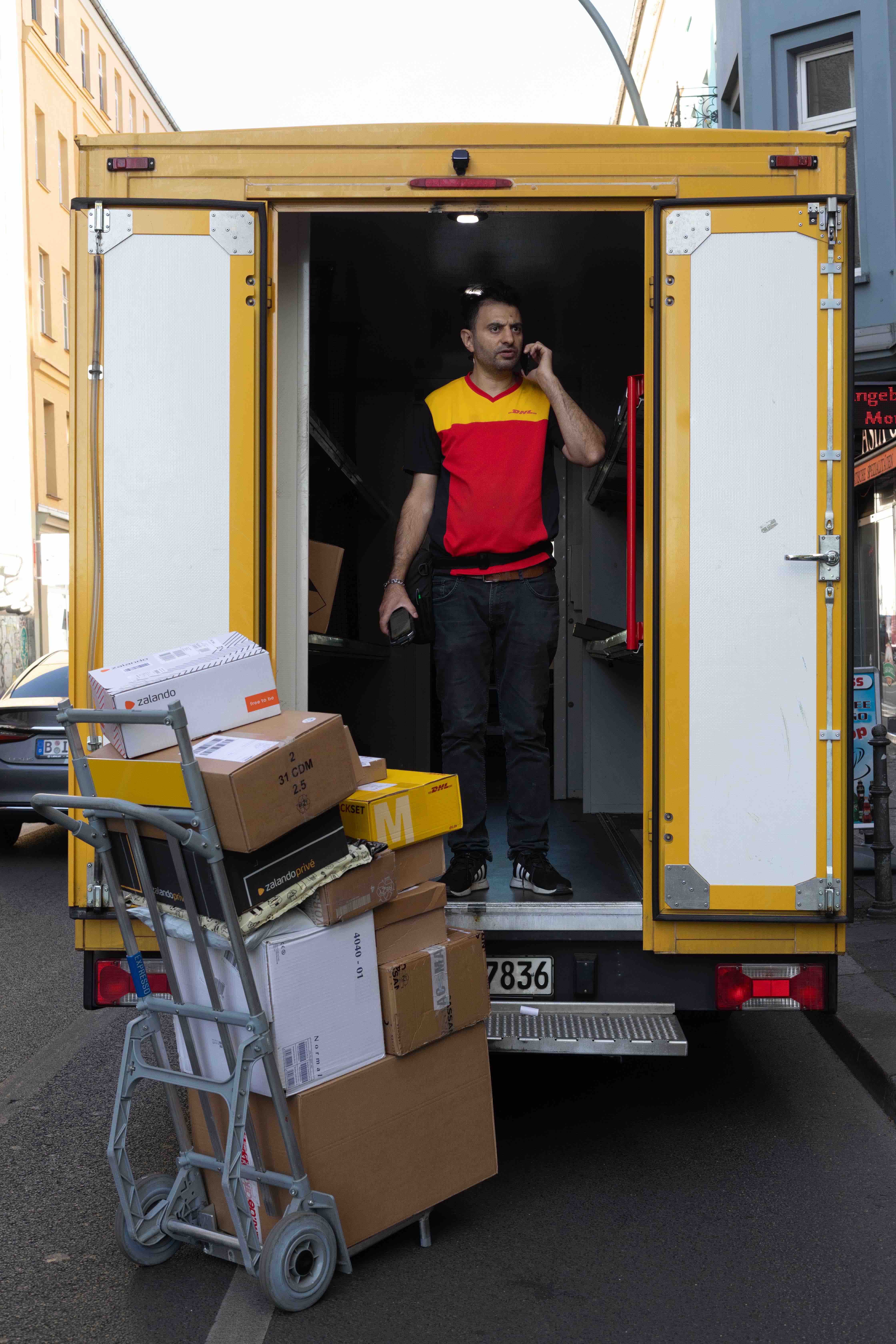 Unloading Goods is a performance involving the exhibition of a series of photographs. The performance starts by showing the steps leading up to the display of the images, the “goods”. The process of transportation, unloading and arrangement – the preparation is itself part of the show. This causes the viewer to focus on the delivery of goods, an incidental, almost unseen part of everyday urban life chiefly noticed for the disruption caused by the nonchalantly double parked delivery vans with their blinking hazard lights. The series of photos, which are fixed to pallets, are portraits of delivery workers unloading their vans, got inspired by the thought, that the cargo area could lead to a Kammerspiel on the streets.
